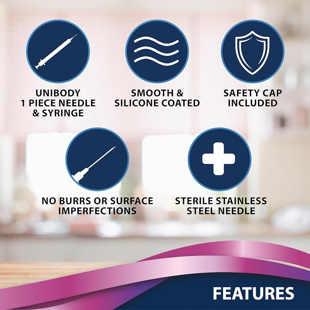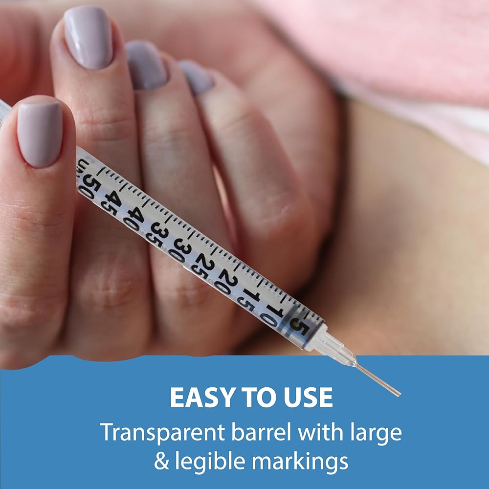 Easy to Read and Use: A transparent barrel with large, legible unit lines and finger flange assist with steady dosage control. The smooth, silicone-coated insulin needle is free of burrs or surface imperfections for greater comfort