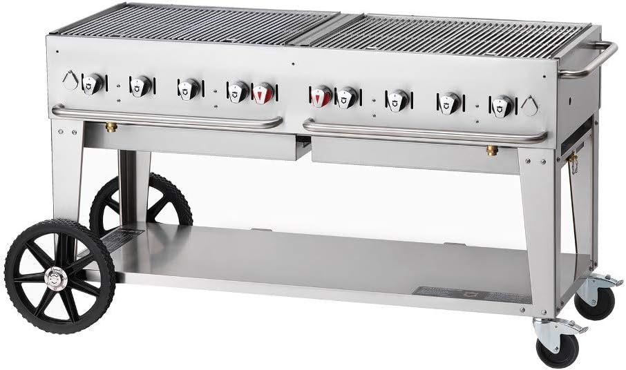 Crown Verity's Mobile Outdoor Charbroiler, LP gas, 58" x 21" grill area, 8 burners, 304 stainless steel construction, stainless steel grill, radiants, lighter tube (pilot), water pan, includes hose & regulator, undershelf, legs with (2) 14" wheels & (2) total lock casters, 129,000 BTU, cETLus, ETL-Sanitation. LP gas, standard.