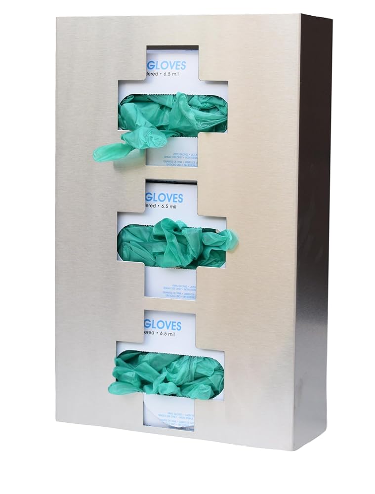 PROMOTES GLOVE WEARING. Easy to access, this dispenser serves as a reminder to put on a pair of gloves before you start working, cleaning or getting involved in a messy job. When empty, the boxes simply slide in and out to make restocking a breeze.