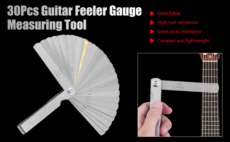 • MULTIPLE BENIFIT: Feeler Gauge Set can measure the clearance of fret and fret board, the height of pickup and strings, nut slot depth, uneven fret board, etc. Also each gauge surface is marked with both metric and clear measurements for your convenience. Worth buying! Ideal measuring tool for guitarists.