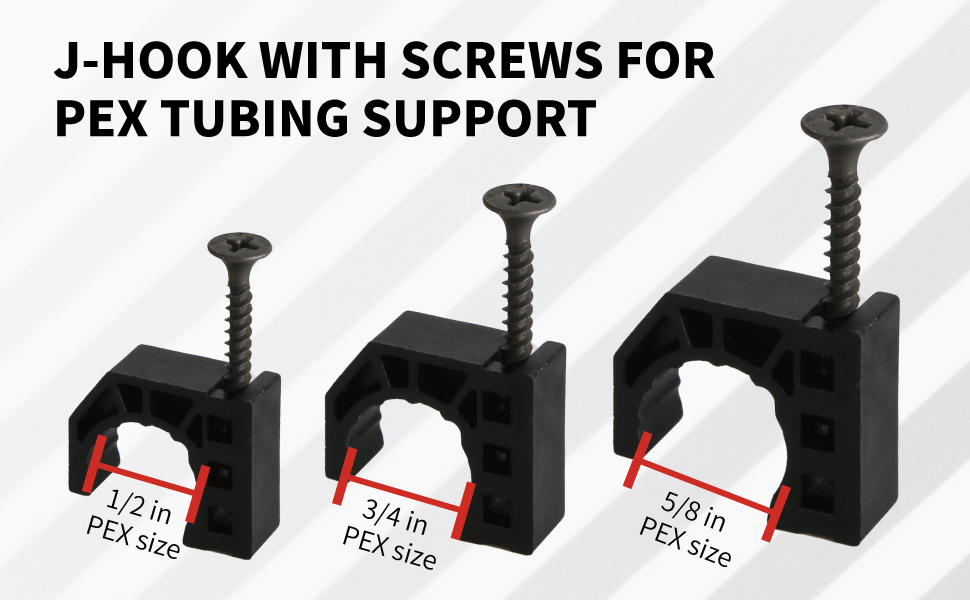 Application: Our J-clamp recommended by plumbers can be applied to attach pipes, like PEX, CPVC, and copper, to wall surfaces such as studs, joists, plywood, subfloor, and more. J hook wall mount features a pre-inserted single screw that is ideal for securing and hanging CTS piping.