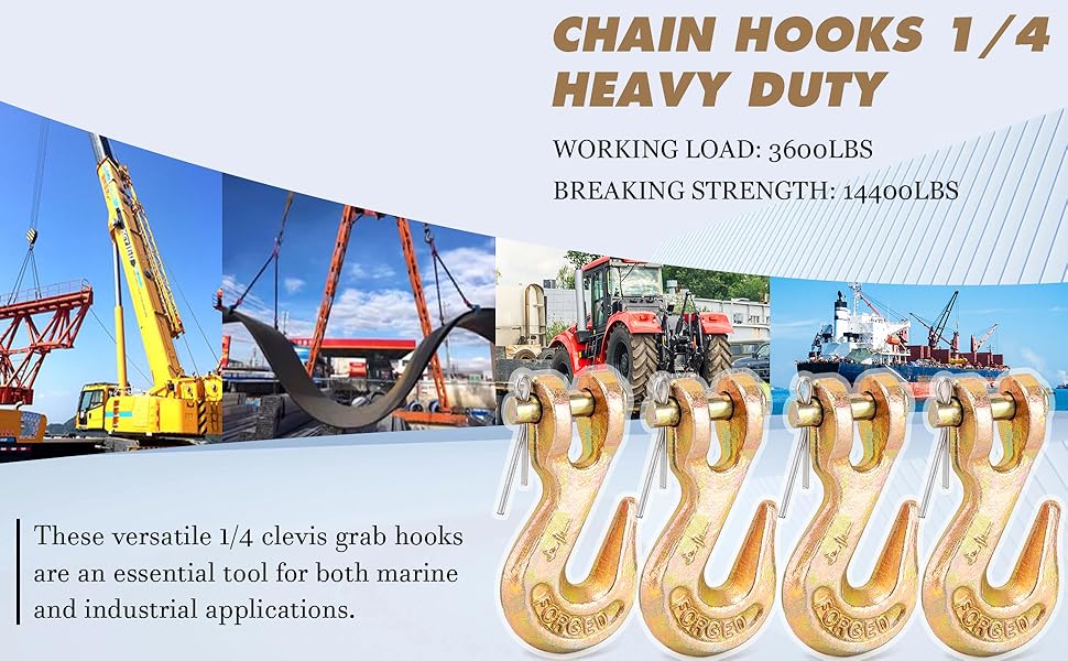 Chain Hooks 1/4 Heavy Duty: Our heavy duty 1/4 chain hooks with working load limit capacity of 3600lbs and breaking Lload: 14400lbs, Non-slip handling, forged 1/4 chain hook is perfect for connecting heavy-duty safety chains or securing transport binder chains