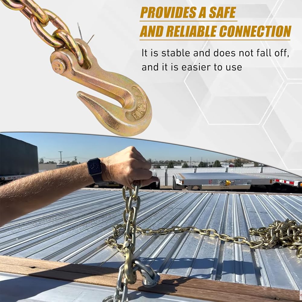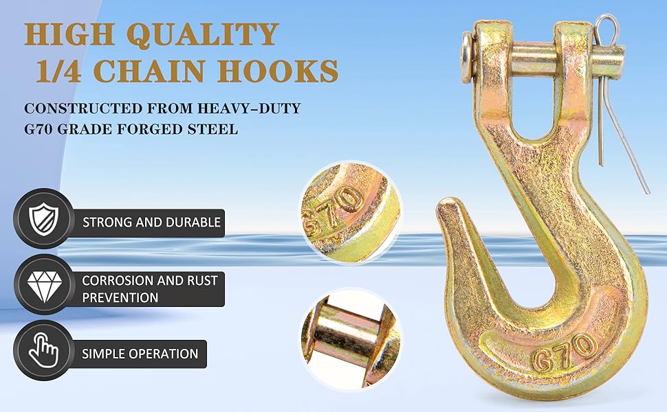 Easy to use: Our grade 70 chain hooks is designed to fit 1/4 inches chains, work with transport chain and ratchet load binder. This heavy-duty g70 1/4 chain hook is versatile and can be used for sling towing and dragging utility trailers, flatbed trailers, trucks, and more. 1/4 chain hooks grade 70 is easy to use, easy to install, and provides a safe and reliable connection