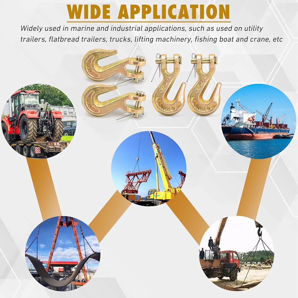 Wide Application: Our 4 pack 1/4 chain hook is widely used in marine and industrial applications, such as used on utility trailers, flatbread trailers, trucks, lifting machinery, fishing boat and crane, etc