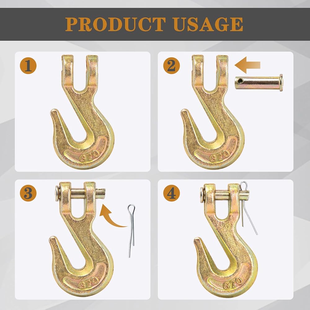 High Quality Material: Our 1/4 clevis grab hooks is made of high-quality heavy-duty G70 grade forged steel. It features yellow chromate finish providing excellent weather protection, enhances its tensile strength, improves resistance to wear, and ensures longevity