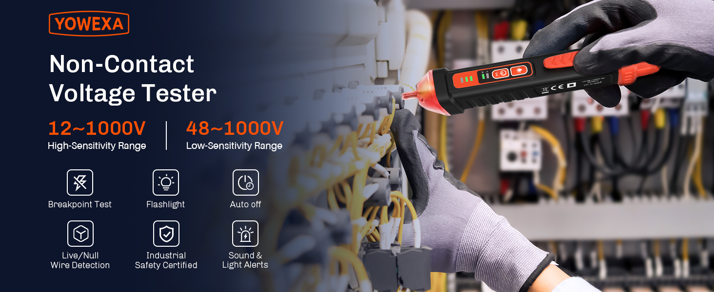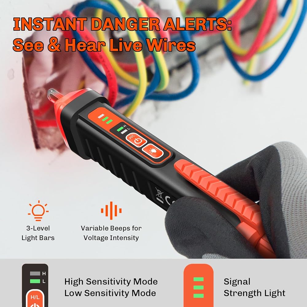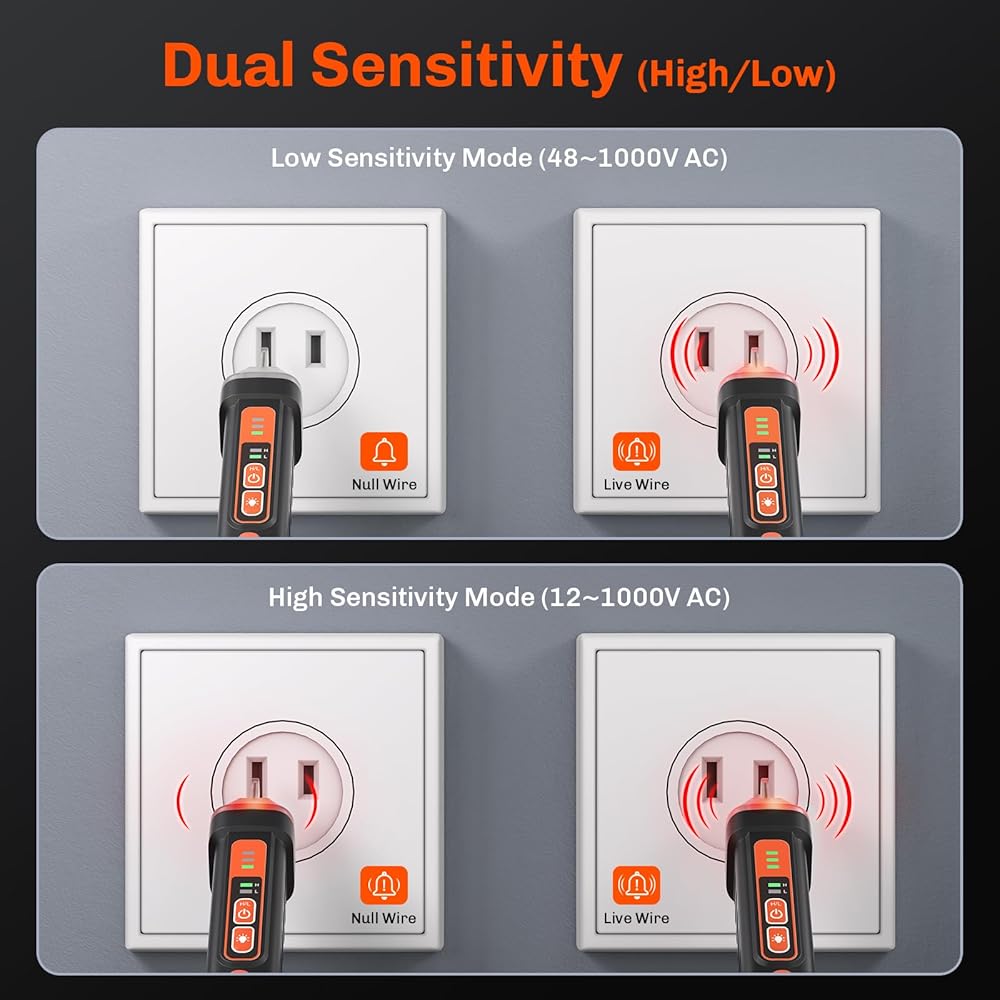 • Non-Contact Voltage Detection: Safely test AC voltage (12-1000V High Sensitivity / 48-1000V Low Sensitivity) without touching wires. Audible beeps and flashing LED lights instantly alert to live current in outlets, switches, or cables.