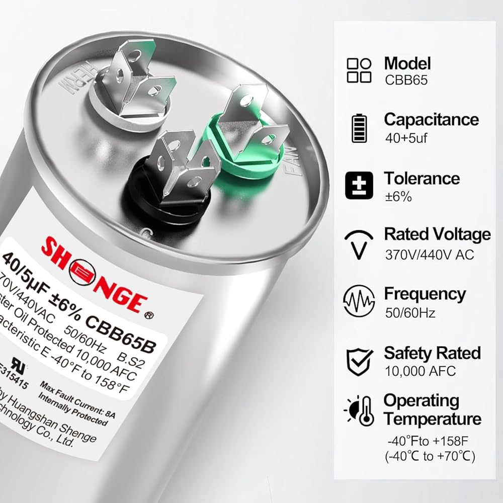 【UL-Certified CBB65 Capacitor】Engineered to meet the highest standards for AC motor run applications. Rigorously tested for durability, our capacitors deliver reliable performance and are built to last over 5 years under normal operating conditions.