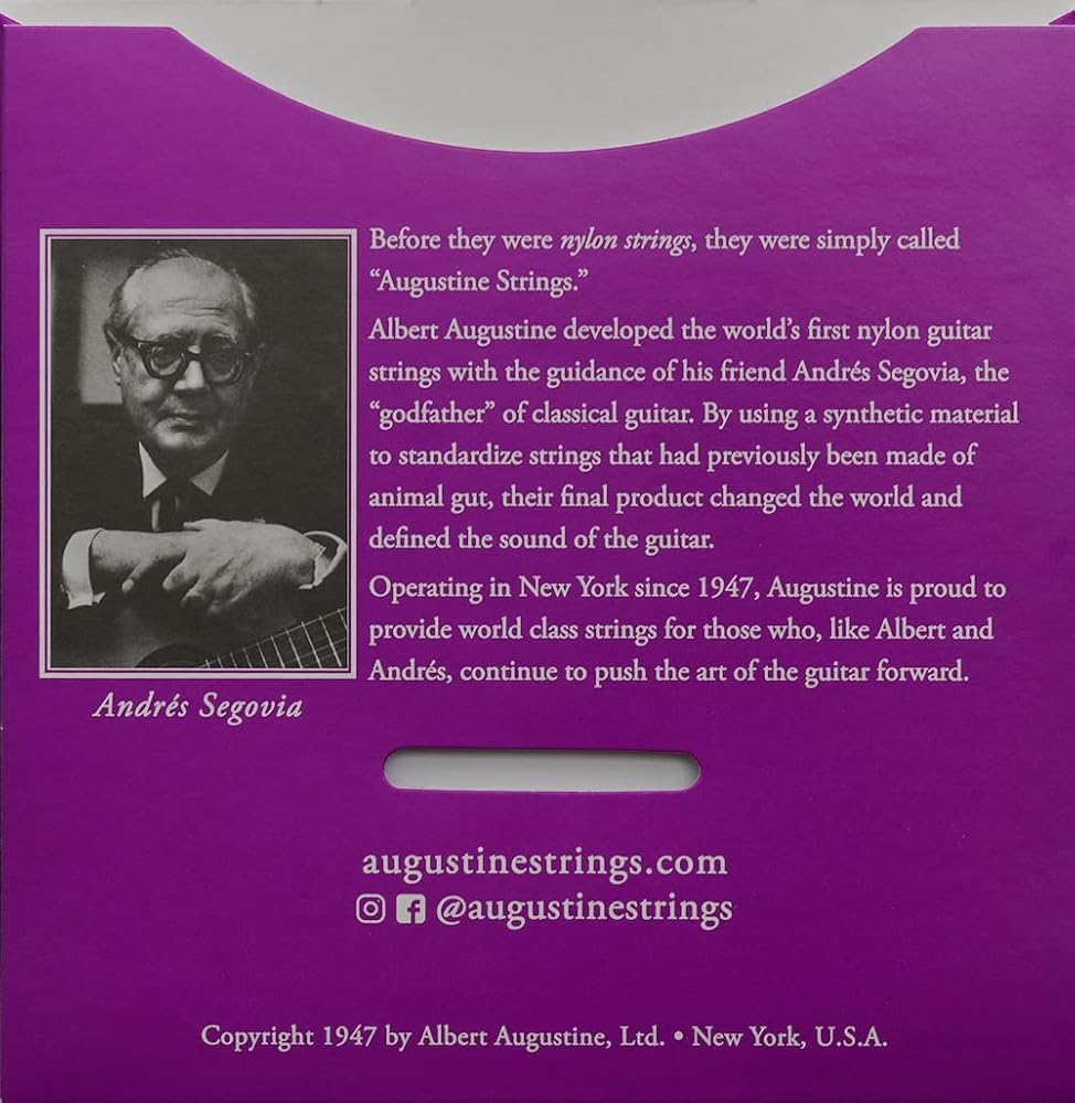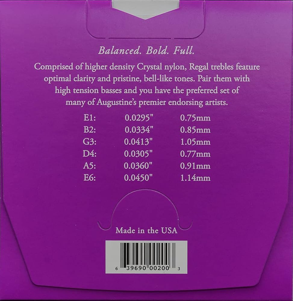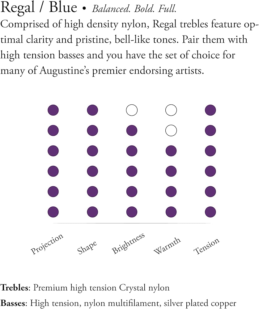 The superior concert string played by the great masters! Augustine Classical Strings are designed to give you endless possibilities that will best suit your particular needs. The best way for you to decide which of our strings sets will sound best on your guitar is simple: try them and let your ears be the judge. Match one bass and one trebles set. The Regal strings offer premium Crystal nylon trebles that offer brilliant, bell-like tone. Made in the USA. Regal blue strings include extra high tension trebles as well as high tension basses and features: · E1 - .0295 inch. - 0.75mm · B2 - .0334 inch. - 0.85mm · G3 - .0413 inch. - 1.05mm · D4 - .0305 inch. - 0.77mm · A5 - .036 inch. - 0.91mm · E6 - .045 inch. - 1.14mm