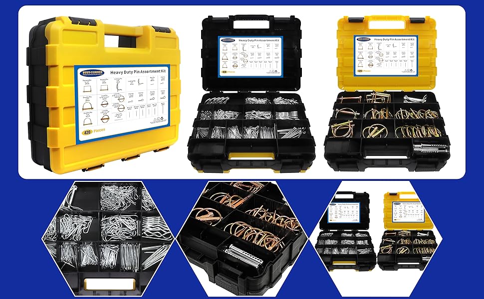 Packing: 420PCS hitch pins clip pins are packed in a heavy duty double side organizer with removable dividers, which saves space and is portable, can help you find the lock pin you need quickly. If the locking pins in the box are used up, the box can also be used to hold other things