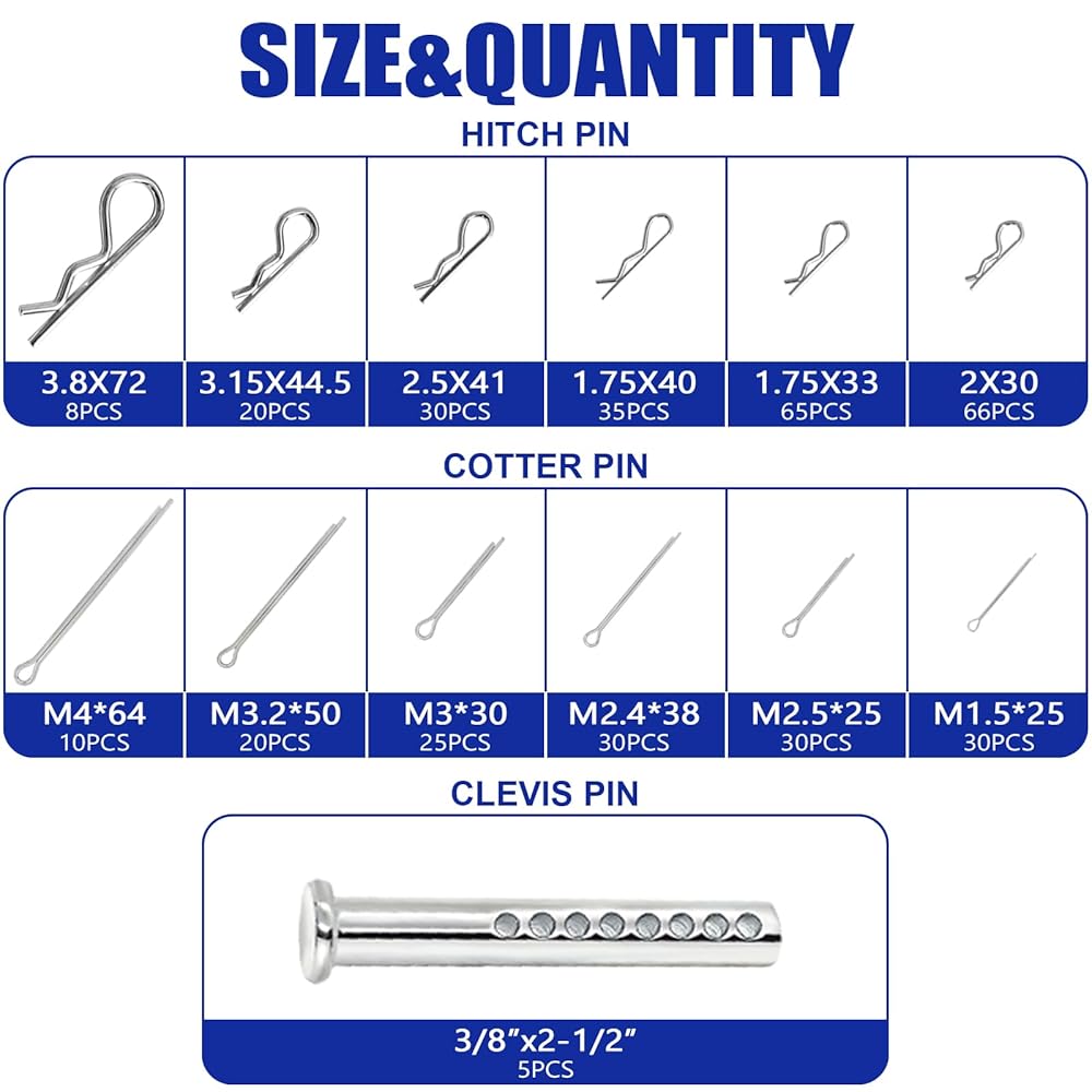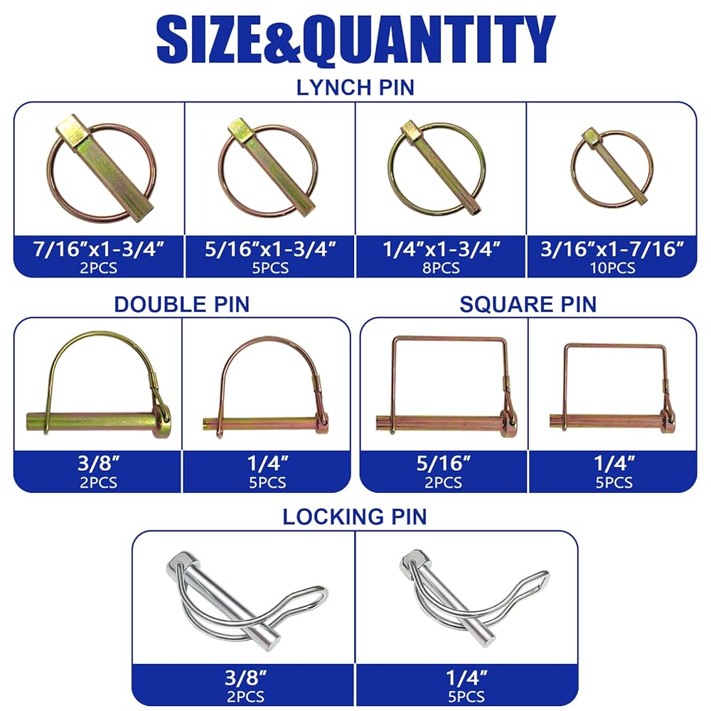 Function: Heavy Duty Pin Assortment Kit, suitable for most quick release applications, such as farms, lawns and gardens, trailer couplers, etc. It is a perfect substitute for locking position and missing parts
