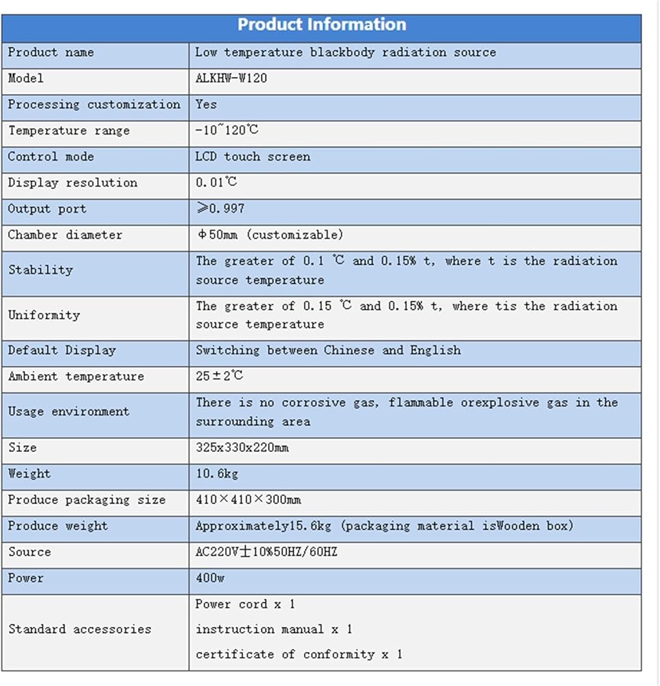 Arionyx Blackbody Radiation Source ALKHW-W120, Temperature Calibration