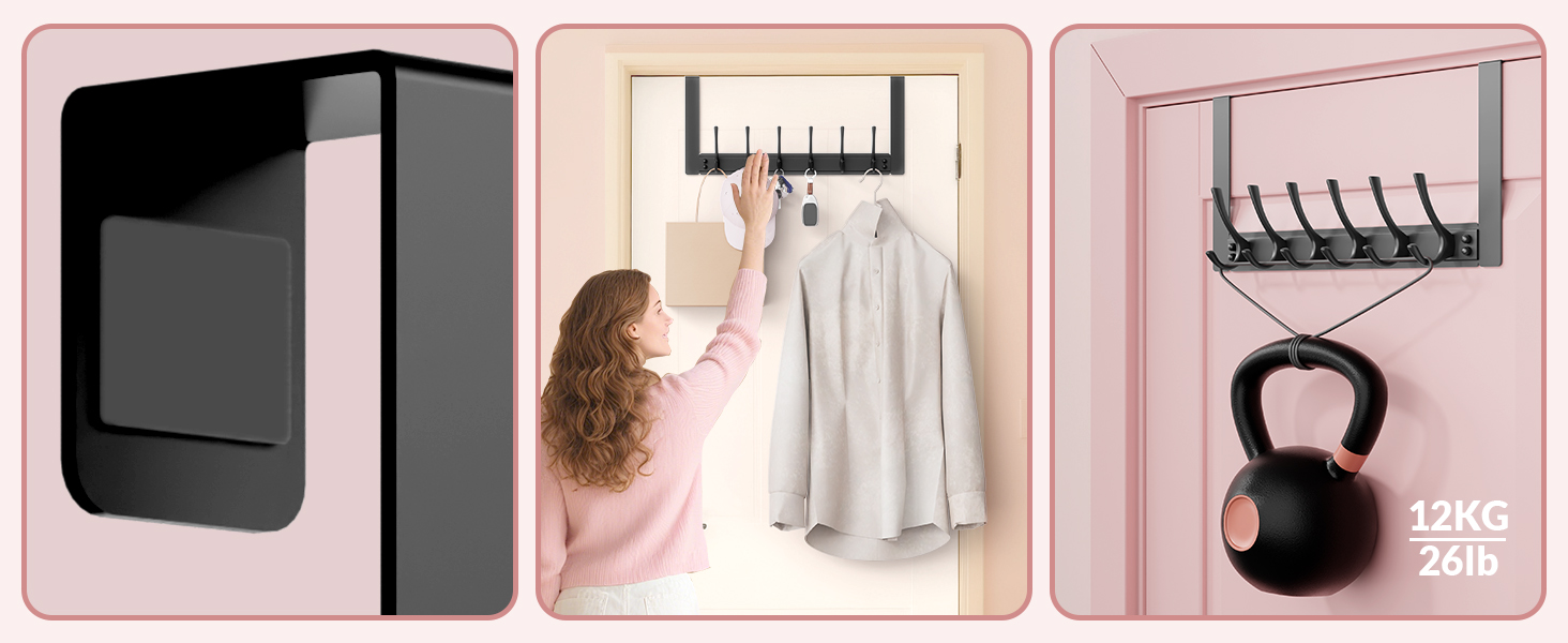 Heavy Duty Structure: This door hanger hook is made of durable metal, offer superior strength, rust resistance, and won't bend. Each hook holds up to 26 lbs, Strong enough for thick winter coats, heavy bags, tools, or gear—without sagging or breaking