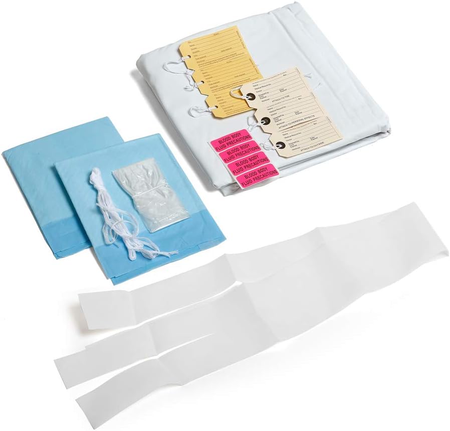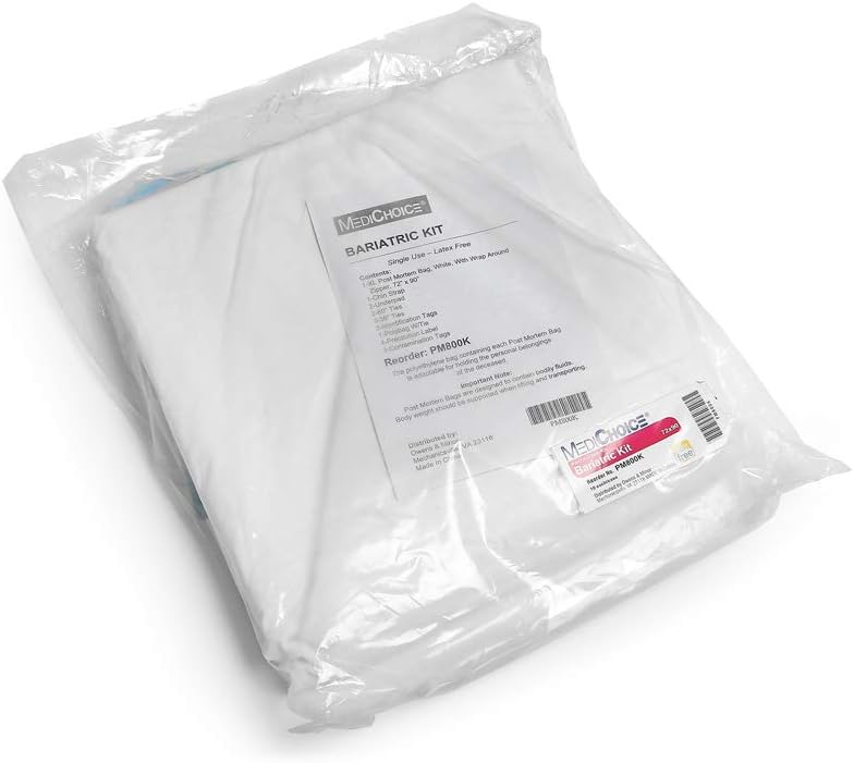 MediChoice Bariatric Postmortem Kits includes a 72 x 90 inch bag with curved zipper, 3 ID tags, 3 contamination tags, 1 chin strap, 2 underpads, 2-60 inch ties, 3-36 inch ties, 1 polybag with tie and