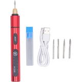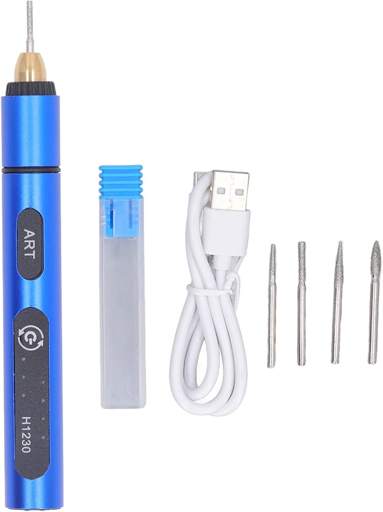The Electric Engraving Pen is an aluminum alloy mini engraver machine designed for accurate and portability. It features a built-in safety circuit board and intelligent overload chip to ensure safe use. With Variable speeds from 5000 to 18000 r/min, it's suitable for various materials. Made from premium aluminum alloy, this engraving pen is lightweight and easy to control. The quiet and portable design make it for DIY crafting, jewelry design, and other engraving projects. The set includes 4 grinding heads, a grinding head storage box, a USB cable, a manual, a storage box, 3 cutting blades, a connecting rod, and 2 drill bits.