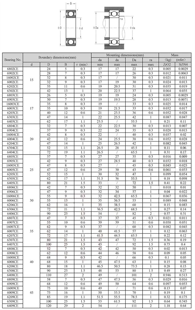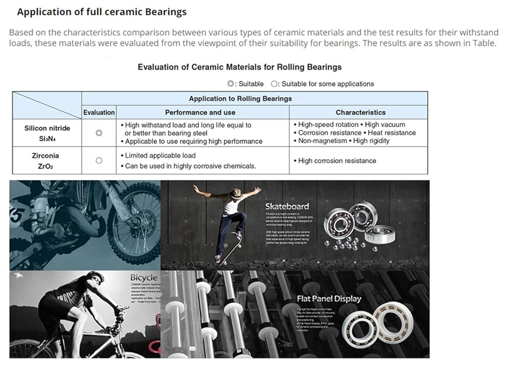 Full ceramic bearing made with Si3N4 have some better performance than ZrO2 the rings and balls made by full ceramic material:Si3N4 as a standard construction the cage made by PTFE Compares than the material of ZrO2 The SiN4 ceramics bearings could endure heavier load and could be used in higher temperature environment.
