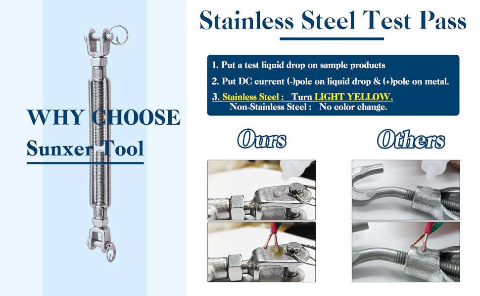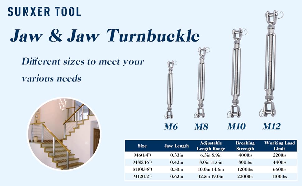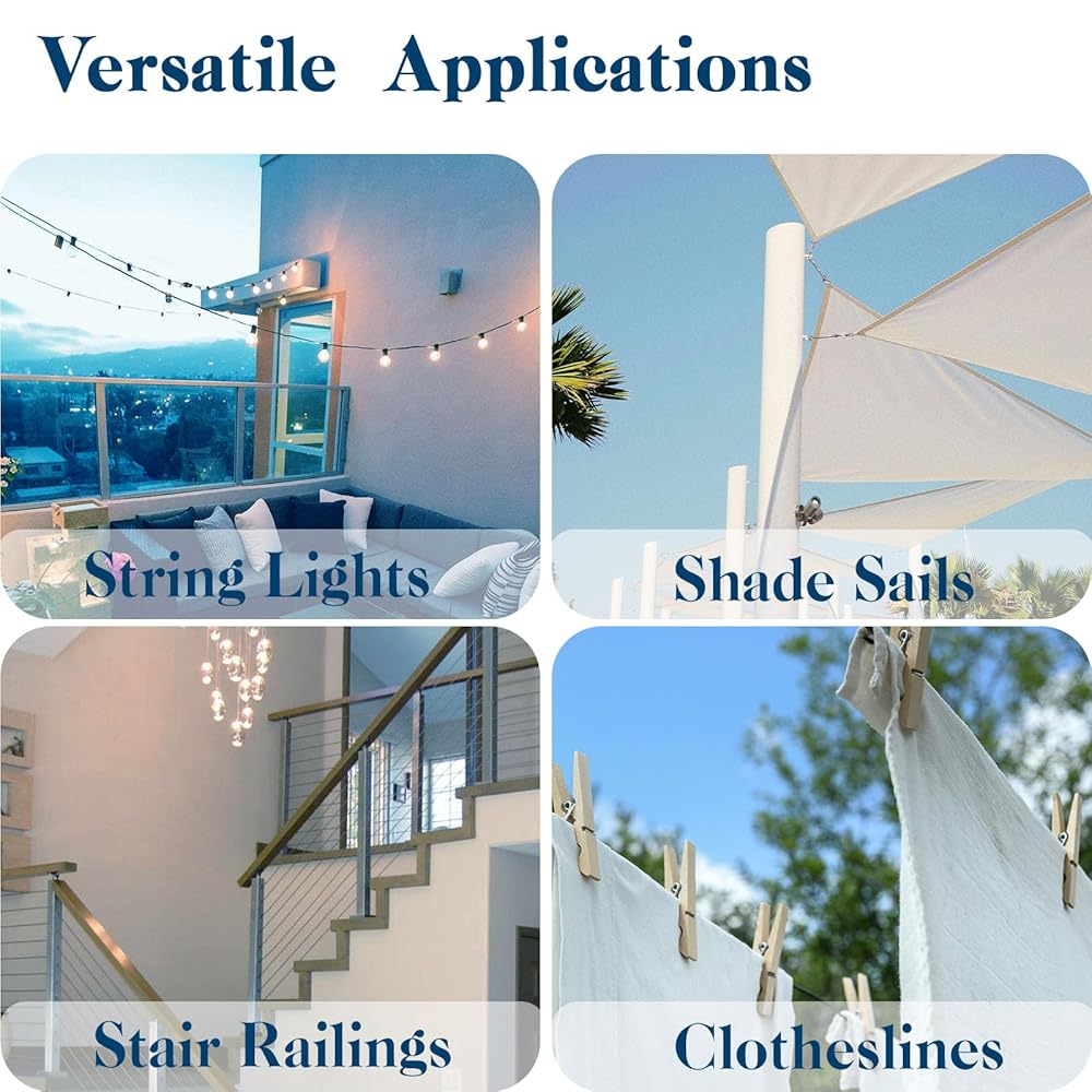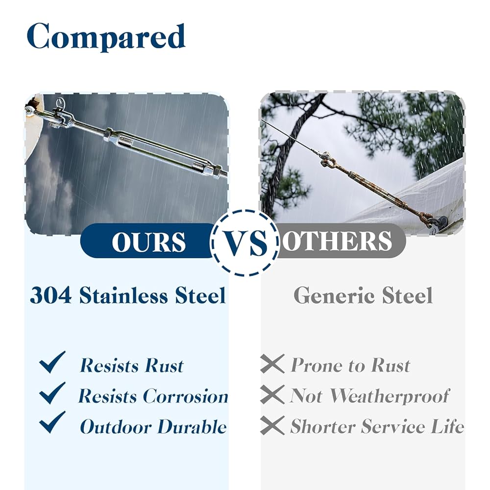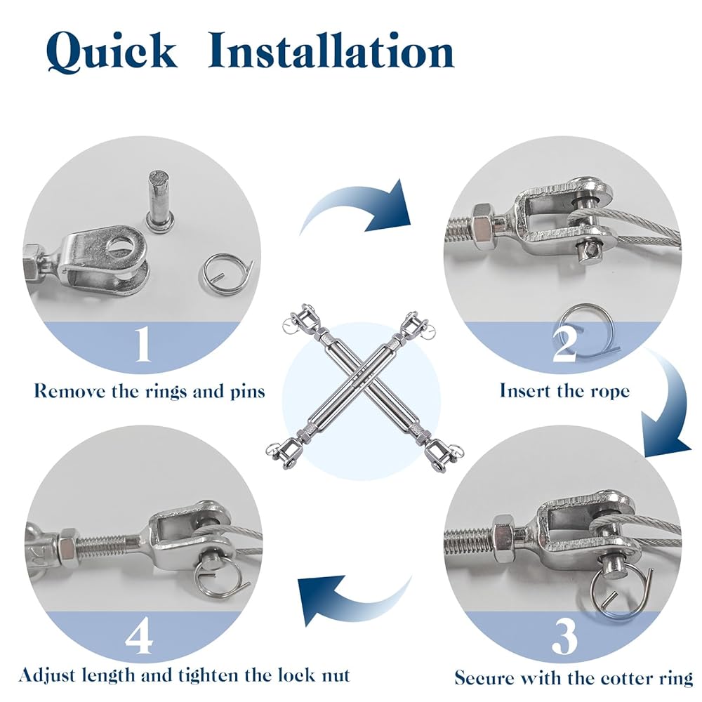 【Premium 304 Stainless Steel】Our Jaw & Jaw turnbuckles are crafted from high-quality 304 stainless steel. It offers superior resistance to rust, corrosion, and wear, ensuring reliable and durable performance in humid or outdoor environments . Ideal for long-term use.