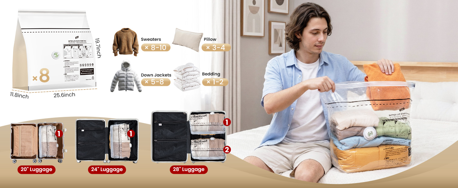 Perfect Fit for Travel & Home: Sized at 25x19x11 inches to fit most standard carry-ons, duffel bags, and backpacks. The widened stereoscopic design eliminates empty gaps between clothing, maximizing suitcase space and compressing contents up to 3x their original volume. More room for souvenirs, less clutter at home