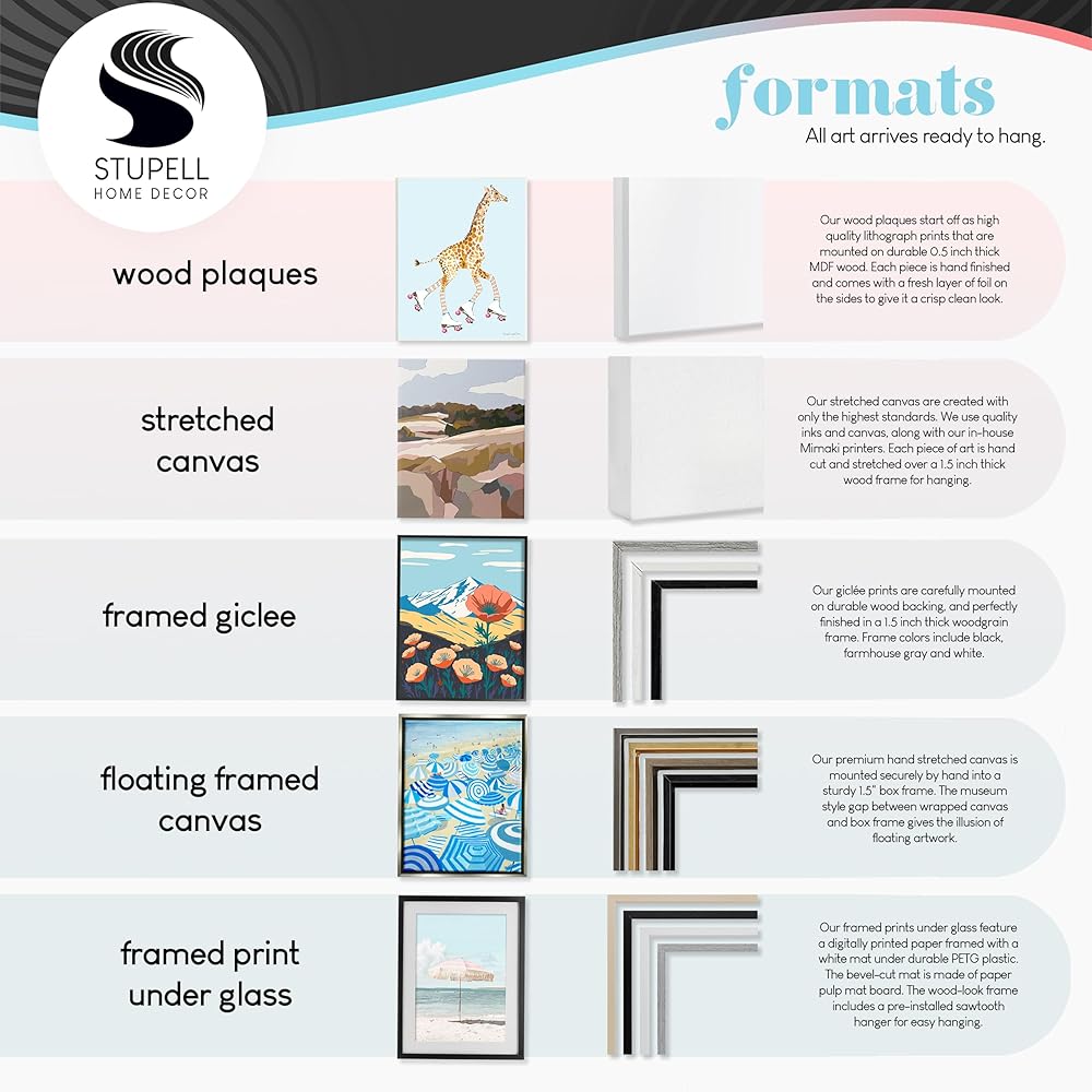 We create our stretched canvas to the highest standards. Using only the highest quality inks and canvas on Mimaki printers, we hand-cut and stretch each piece over a 1.5-inch thick wooden frame for hanging. As a result, the art comes ready to hang on the sturdy ledge with no installation required. Stupell Industries Wall Art is made in the USA.