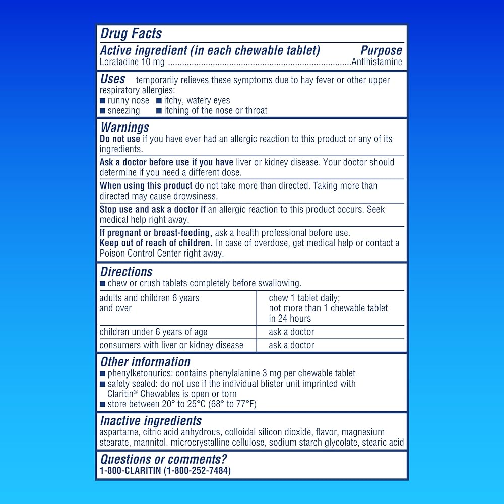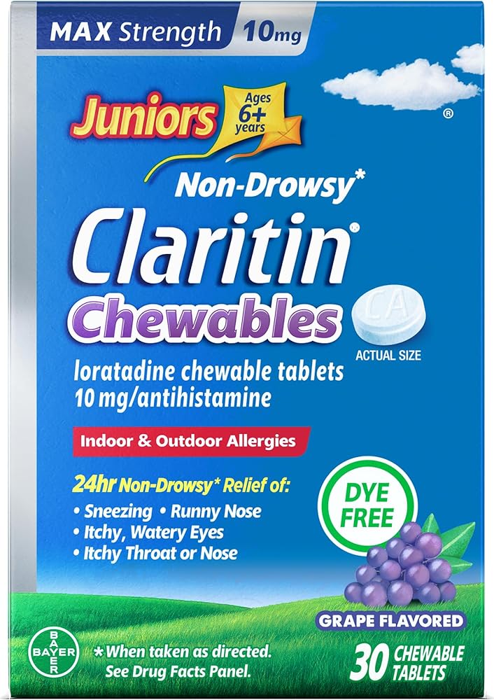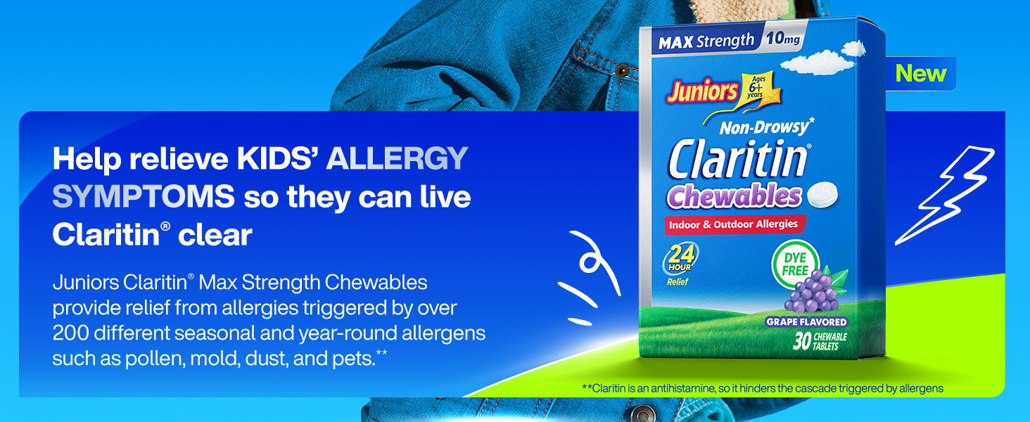 Claritin Juniors Max Strength 10mg Chewables were made with kids 6+ in mind. One dose of our maximum strength grape flavored kids allergy medication provides 24-hour allergy relief from symptoms such as sneezing, runny nose, itchy and watery eyes, and itchy throat. With 10mg Loratadine, this powerful antihistamine relieves symptoms by blocking the histamines that your child's body produces in response to allergens, providing the relief they need to get through their day. Unlike other children's allergy medicine that can cause drowsiness, Claritin Max Strength Chewables are non-drowsy, so your child can take them day or night to effectively relieve their allergies without making them sleepy.** These chewable tablets are for kids 6+ years and are a convenient option for parents who want to provide their child with effective allergy relief in just one dose. With just one chewable tablet per day, your child can experience 24 hours of allergy relief and get back to doing the things they love. Plus, rest easy knowing that this family-favorite is a dye, sugar, and alcohol free children's allergy medicine. *Maximum available OTC strength as compared to 5MG Children's Claritin Chewable **Claritin is an antihistamine, so it hinders the cascade triggered by allergens ***Among oral OTC allergy brands