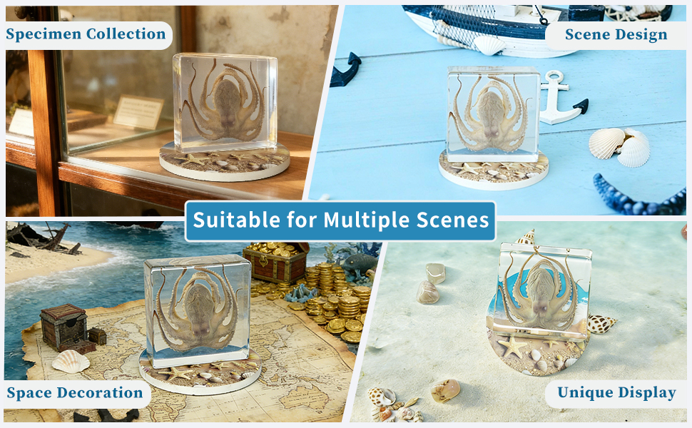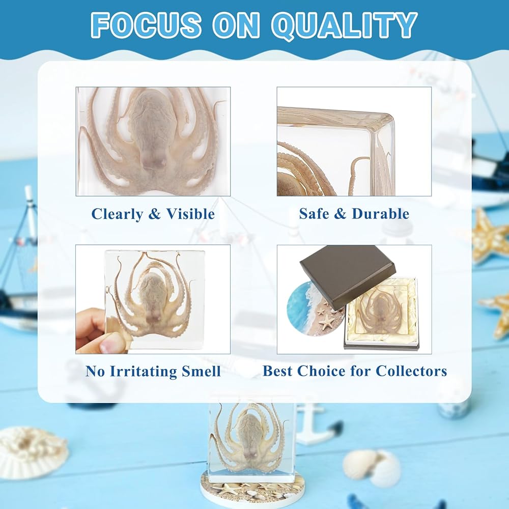 High Quality:This Octopus taxidermy is crafted from high-density resin, combining preservation sturdiness and safety with a transparent, odorless, non-irritating resin casing that reveals the specimen's intricate details. A unique marine collectible for oddities lovers and decor connoisseurs