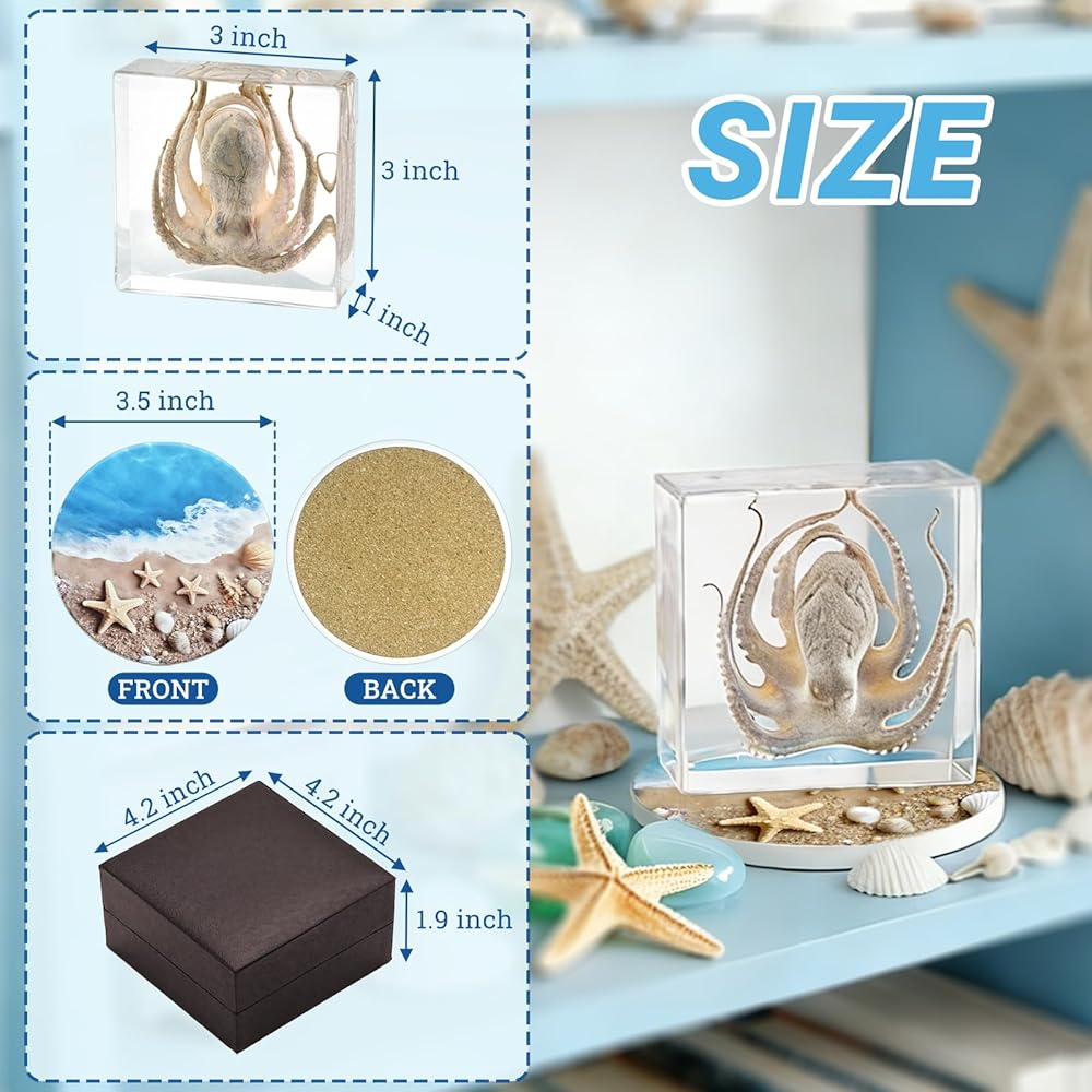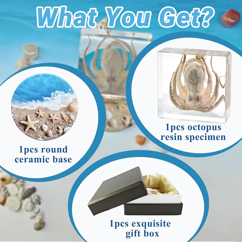 Premium Package: You will receive an approximately 7.5x7.5x2.4cm (3x3x1 inches) octopus resin specimen, placed in an exquisitely designed gift box. The set also comes with an exquisite round ceramic base designed for display
