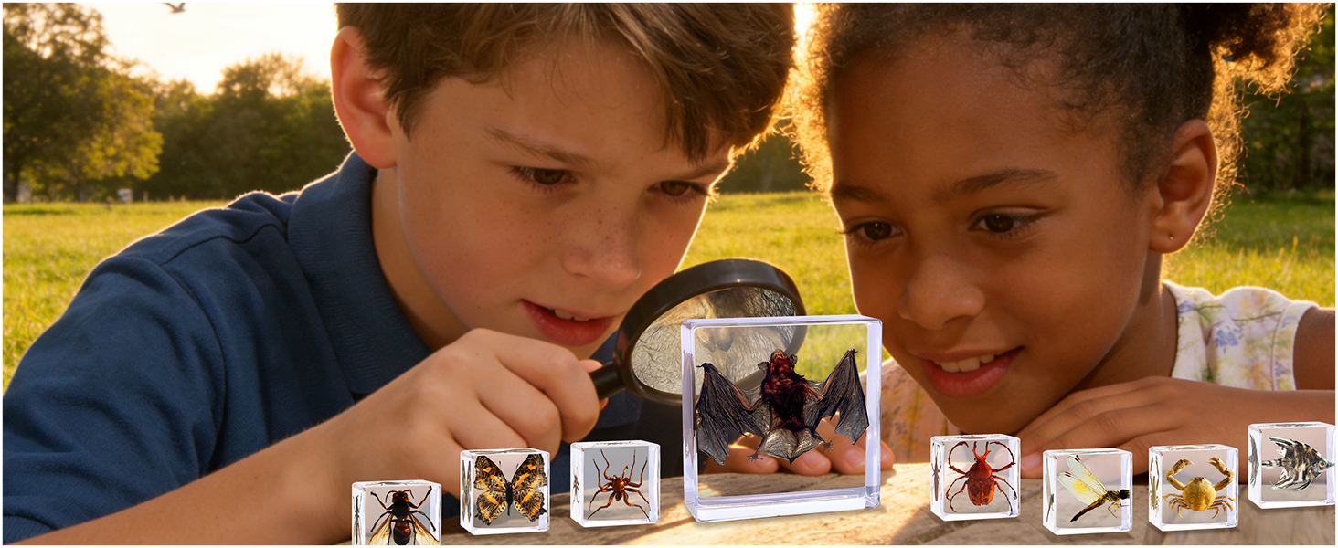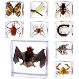 Representative Real Insect Specimen:Our taxidermy bugs features 9pcs iconic species (bat, Spider,bee, butterfly,beetle, fish,and crab ) encased in clear resin offering a hands-on way size . The design showcases their natural and real, allowing you safe and up-close exploration of these fascinating entomology world(2.95 ×2.95 ×0.94 inch for taxidermy bat ,1.5 × 1.5×0.6 inch for others)