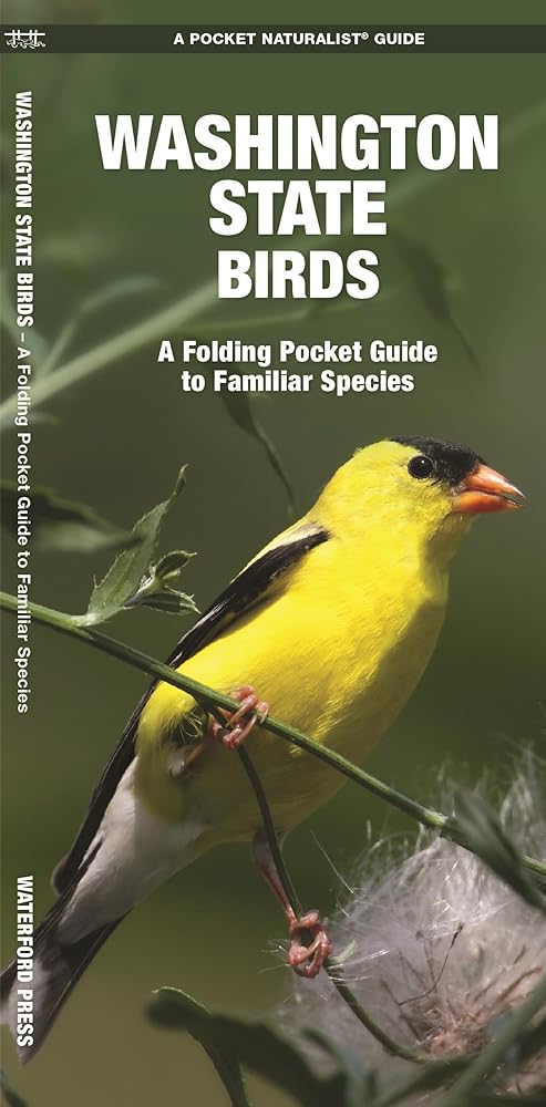 Washington state boasts an impressive diversity of birds, with over 500 species having been observed in the aptly named Evergreen State. The Pacific coast is rich in shorebirds and seabirds, while the mighty Cascade Mountains are home to coniferous forest species like Canada Jay, Gray-crowned Rosy-finch, and Clark's Nutcracker. The many lakes in the otherwise dry shrubby areas to the east of the mountains are magnets for waterfowl. State bird American Goldfinch can be found in grasslands and scrubby edges as well as near human habitation. Birds are often the entry point into nature study, so getting acquainted with an area's most representative species is useful. You can do this with the beautifully illustrated Washington State Birds, which features 140 illustrations of common and familiar species as well as an ecoregion map showing over 20 bird-finding hotspots and learning sites. Laminated for durability, this lightweight, 12-panel folding pocket guide is a terrific resource for educators, learners, naturalists, and birders who wish to sharpen their bird identification skills and peer more closely into birds' fascinating lives. Made in the USA.