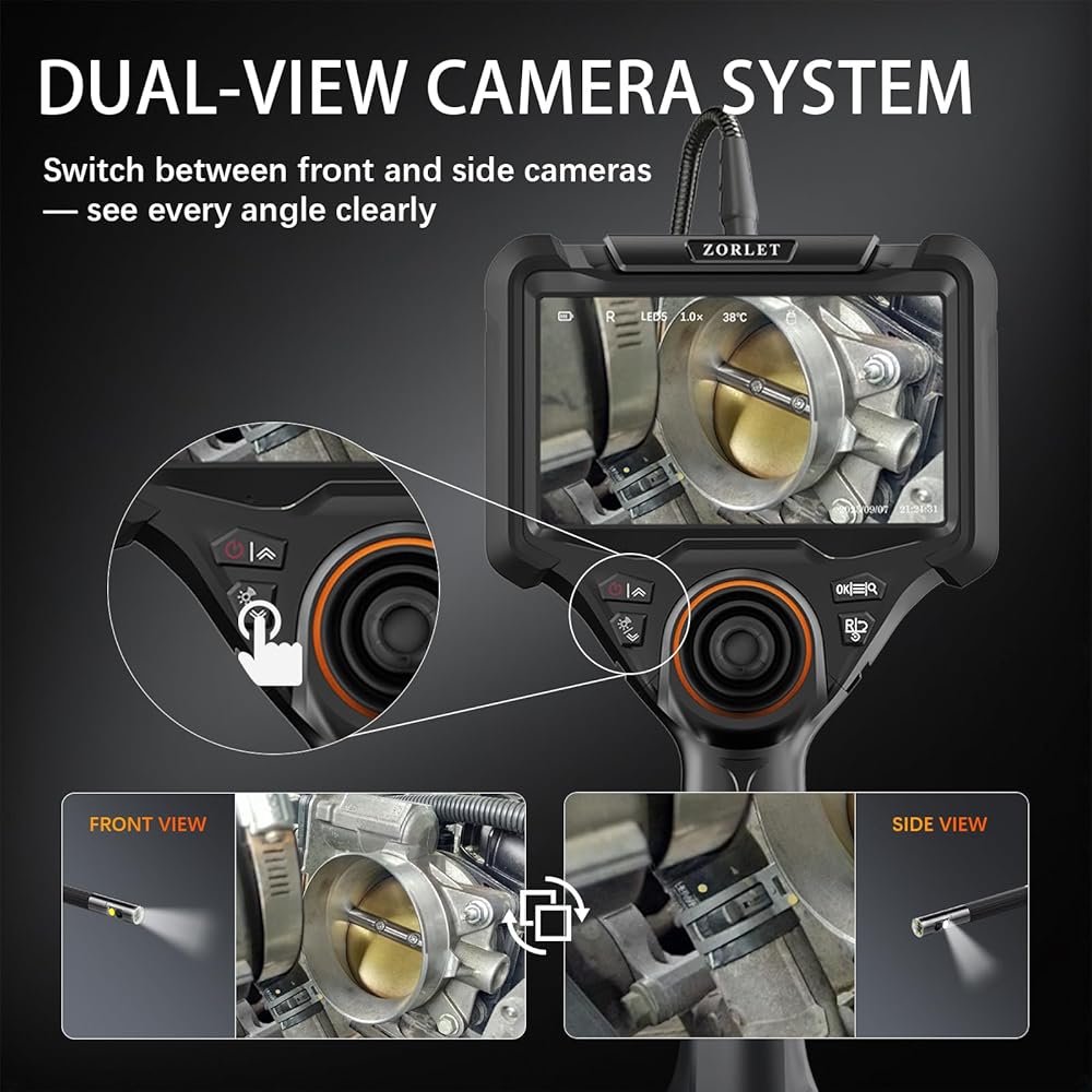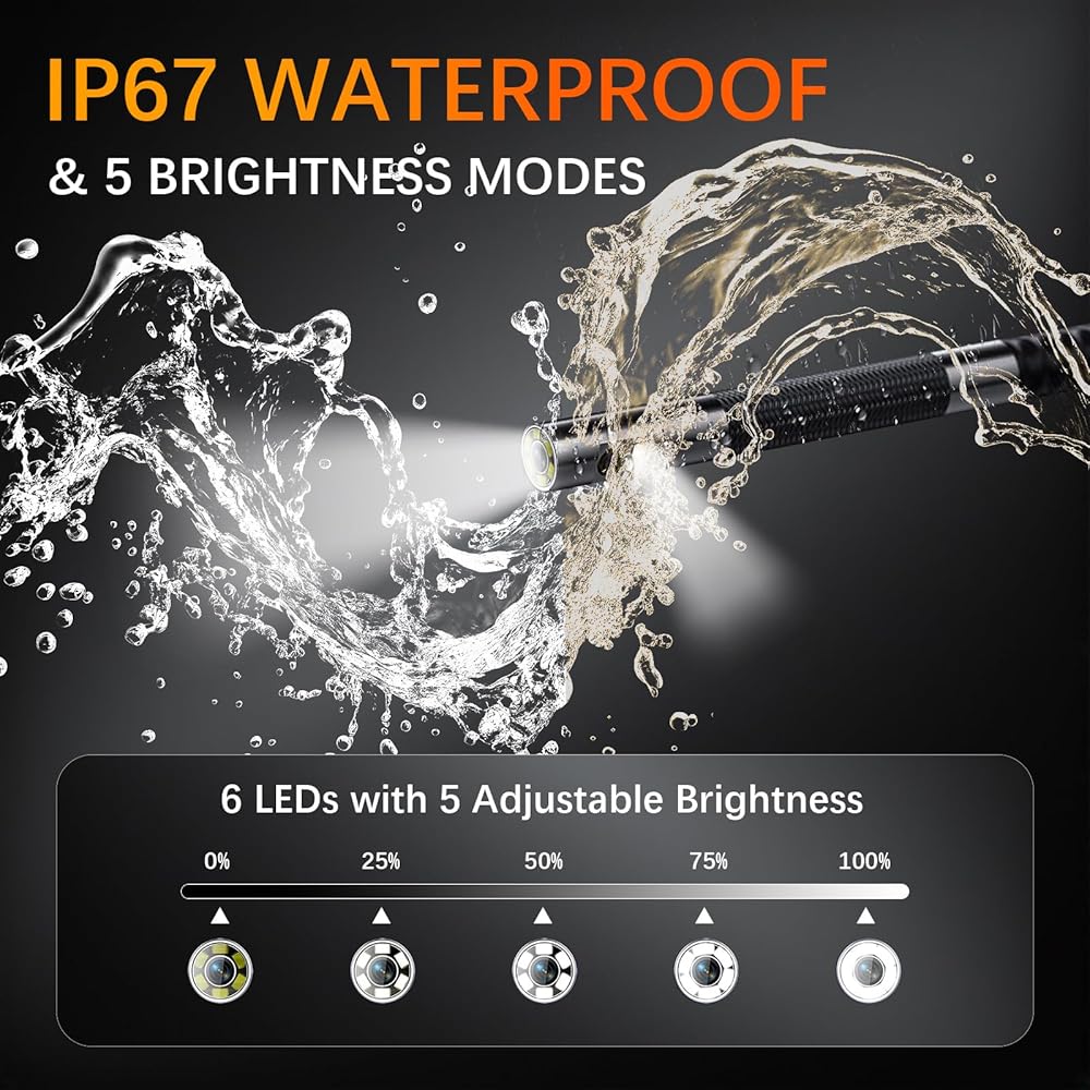 • 【Dual Lens 1080P HD Camera with 6+1 LED Lights】See every detail from multiple angles with the dual-lens design—front and side cameras switch instantly to capture different perspectives and eliminate blind spots. This professional endoscope camera with light delivers sharp 1080P HD images, while 6+1 adjustable LED lights ensure consistent brightness in dark, oily, or reflective areas—perfect for automotive and industrial inspections.