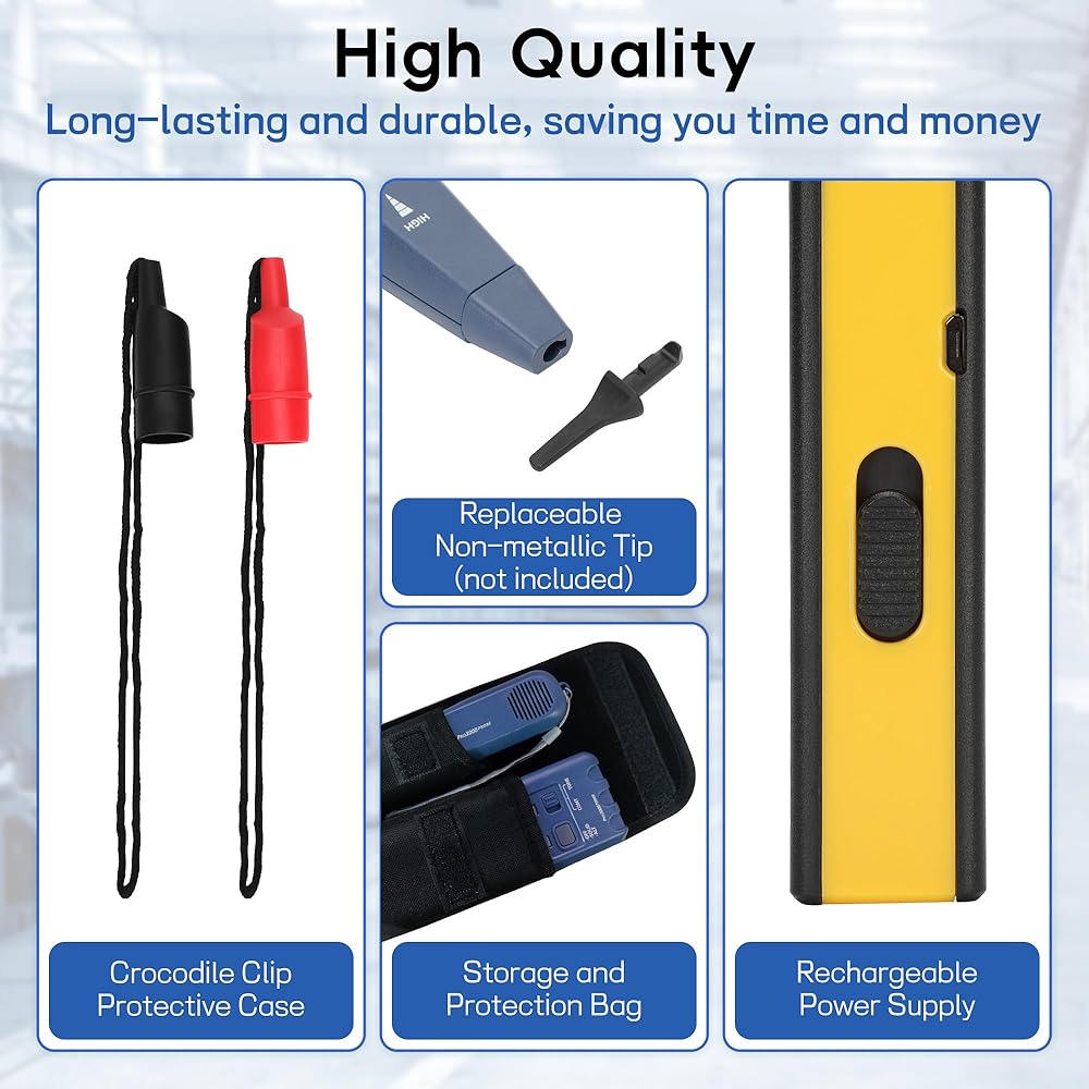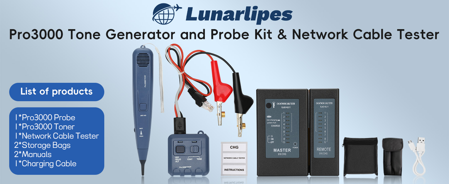 【Pro3000 Tone Probe Kit】 The wire toner is a professional tool for tracing and testing cables and telephone lines for telecom, electrical and other professional technicians and home circuit DIY enthusiasts. Toner electrical tool includes 1 × Pro3000 Tone Generator, 1 × Probe, 1 × Network Cable Tester, 2 × User Manuals, 2 × Storage Pouches, 2 × 9V Batteries and 1 × Charging Cable.