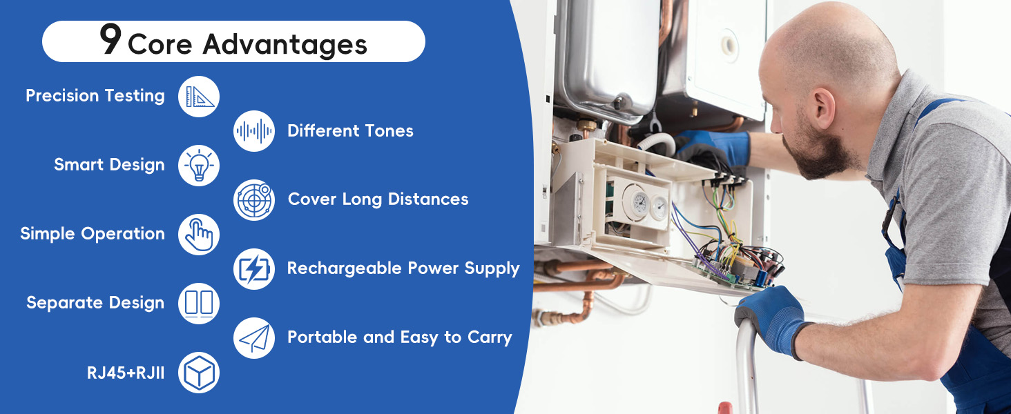 【Accurate Testing】 Wire tracer tone generator utilizes Smart Tone technology to generate alternating sound effects for accurate measurement and matching. No need to worry about distance, for most cables, the toner can send high tones up to 10 miles (16 kilometers). The ethernet tester has a detachable design that allows both the master and remote units to test as long as the ends of the cable are within a limited range of 100 meters.