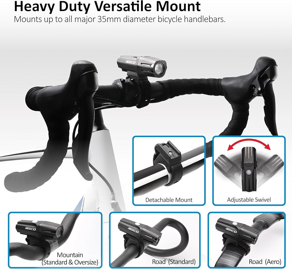 Heavy duty flexible mount attaches fast and easily on many types of handlebars including various aerobars. It swivels left and right to aim the light where needed and uses a quick release function to separate the light from the mount for use as a flashlight or when not in use.