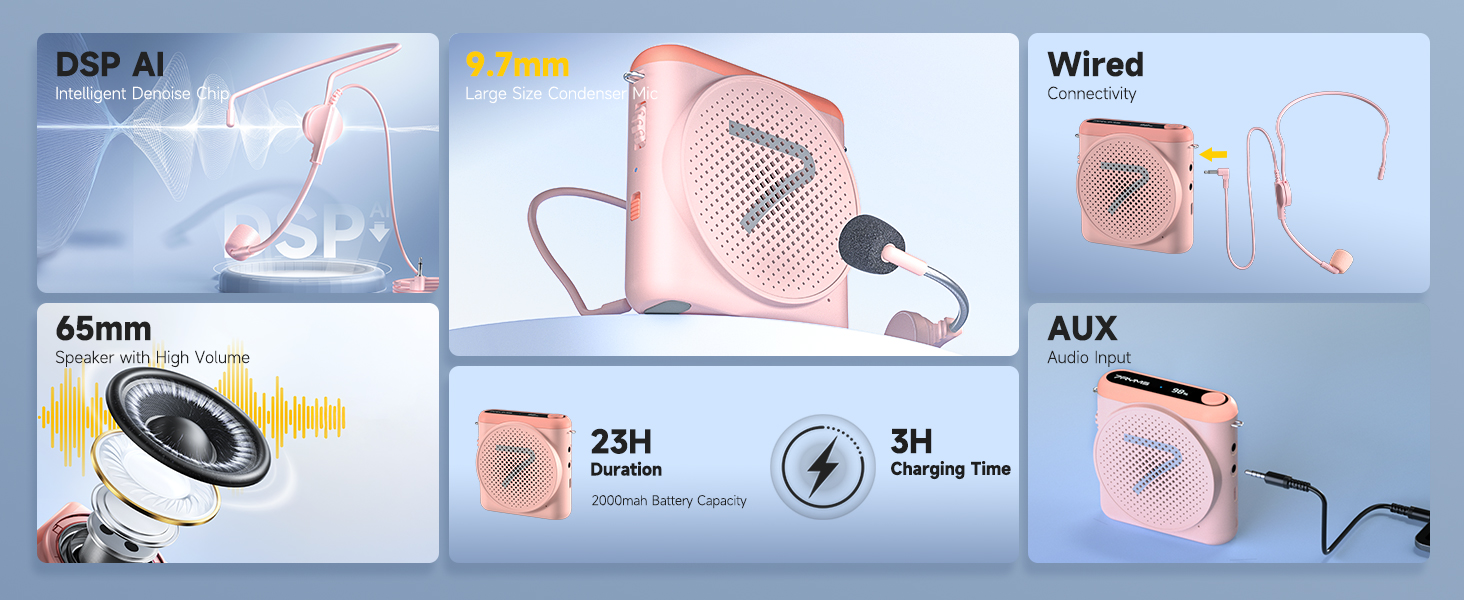 【Long Battery Life up to 23 Hours/28 Days】The Voice Amplifier battery capacity is up to 2000mah, with a long-term battery life of up to 23 hours. Based on 50 minutes per day, it can be used continuously for nearly 28 days.