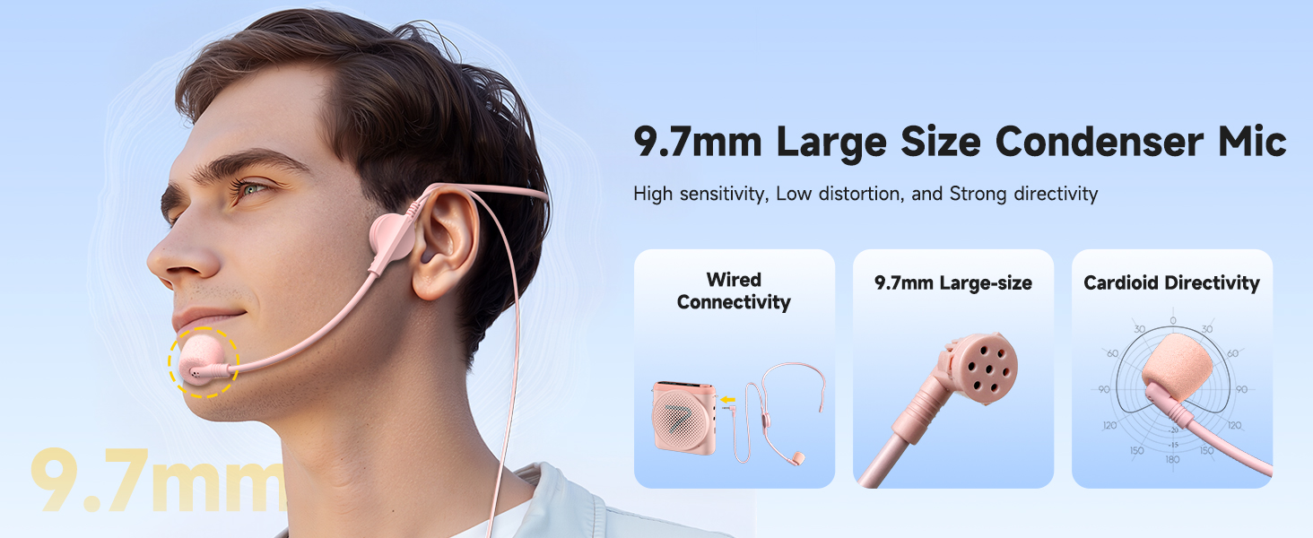 【Voice Amplifier with Wired Headset Microphone】7RYMS WA1(SE) Voice Amplifier with Wired Headset Microphone, which adopts a 9.7mm large size condenser mic capsule. It has high sensitivity, low distortion, and strong directivity, effectively reducing ambient noise and recording clearer sound.