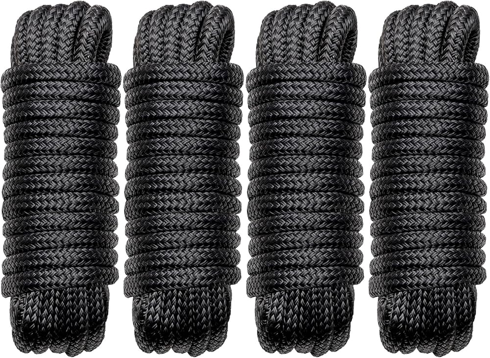 Boat Dock Lines Marine Rope - 1/2" x 15ft with Pre-Spliced 12" Loop Double Braided Nylon Ropes Bumper Tie Mooring Line for Boats Docking Pontoon Boating Accessories - 4 Pack Black