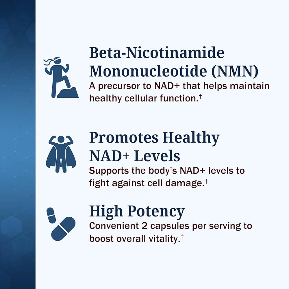 Supports Healthy Aging: This potent nicotinamide mononucleotide supplement is crafted to defend against age-related cellular decline, promoting overall well-being and longevity and supporting a more youthful appearance