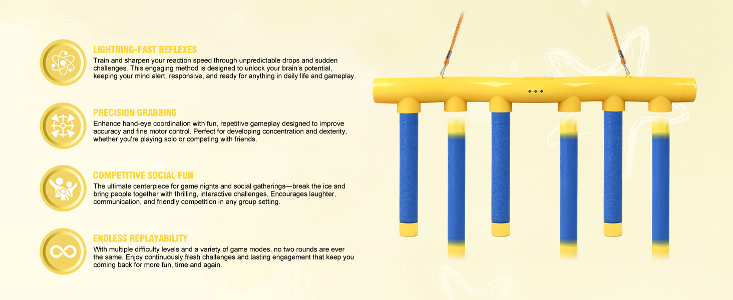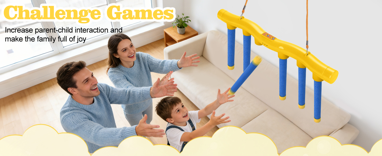 Six suspension hooks bring exciting challenges:Equipped with six hanging hooks to securely hold grab sticks,fully testing your reaction speed and coordination ability,For the best experience, ensure you have a clear, open space around the game setup.