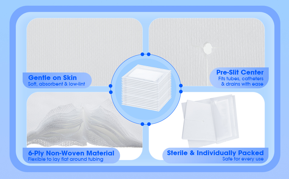 Split Design: our split drain sponge gauze is cut already and has a slit in the middle, can fit various tubes quickly and easily without the need for additional instruments, and allows you to quickly change without causing too much discomfort to people who are uncomfortable