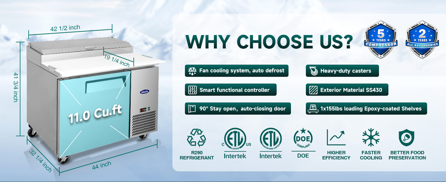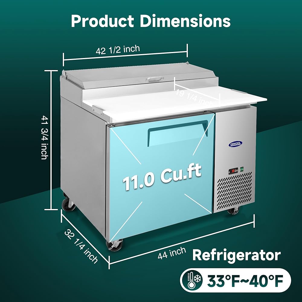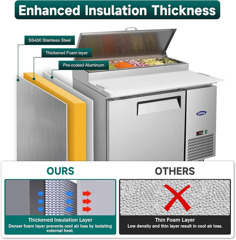 Precision Temperature Control: Digital temperature control, temperature range 33-40°F, accuracy ±1°F, automatic defrost cycle every 6 hours to prevent ice buildup. The R290 refrigerant cools 25% faster than conventional units. Ideal for storing pizza dough, delicate salads, and meats in the unit