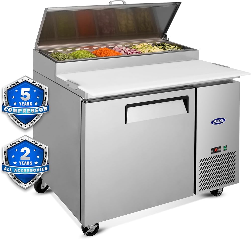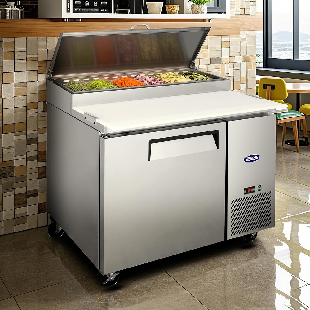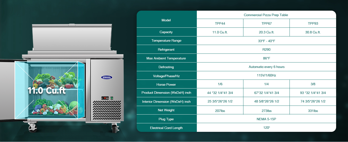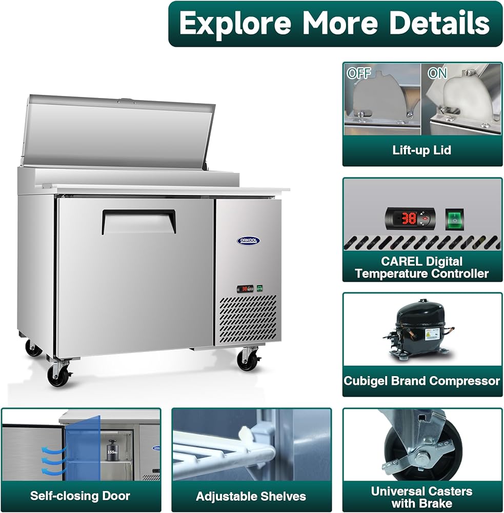 Precision Temperature Control: Digital temperature control, temperature range 33-40°F, accuracy ±1°F, automatic defrost cycle every 6 hours to prevent ice buildup. The R290 refrigerant cools 25% faster than conventional units. Ideal for storing pizza dough, delicate salads, and meats in the unit