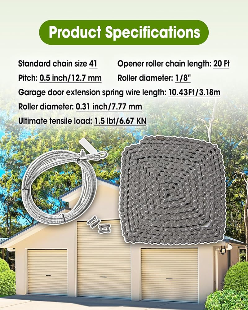Product Specifications: Standard chain size 41.Opener roller chain length: 20 Ft, pitch: 0.5 inch/12.7 mm, roller diameter: 0.31 inch/7.77 mm, ultimate tensile load: 1.5 lbf/6.67 KN. Garage door extension spring wire length: 10.43Ft/3.18m, roller diameter: 1/8"