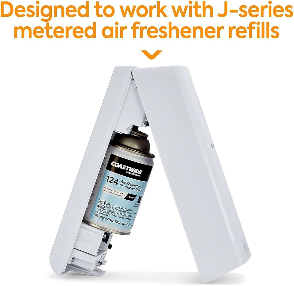 Keep public spaces smelling pleasant all the time using the presets on this Coastwide Professional J-Series Metered Air Freshener Dispenser. Maintain a fresh scent in an office or public space on your schedule with the frequency settings on this Coastwide Professional J-Series Metered Air Freshener Dispenser. With preset options for 7.5, 15, or 30-minute spray intervals, you can select the right timing to suit various locations. LED alerts let janitorial staff know when it's time for a scent refill or battery change, making maintenance and upkeep simple.