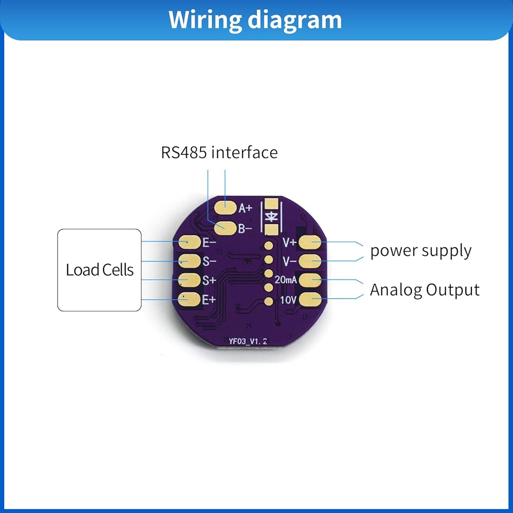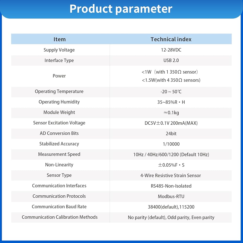 This high-precision load cell transmitter module offers exceptional performance for industrial weighing and force measurement applications. The compact 28mm x 28mm circuit board features a 24-bit AD conversion system with an impressive 1/10000 stabilized accuracy. Supporting 4-wire resistive strain sensors, it operates on 12-28VDC power with USB 2.0 and RS485 interfaces for versatile connectivity. The module handles measurement speeds from 10Hz up to 1200Hz and communicates via Modbus-RTU protocol with adjustable baud rates up to 115200. With its wide operating temperature range of -20 to 50°C and humidity tolerance of 35-85%RH, this transmitter delivers reliable performance in various industrial environments. The device draws minimal power - less than 1W with a single sensor or 1.5W with four sensors connected. Its non-linearity of ±0.05%FS and precise sensor excitation voltage control of DC5V±0.1V at 200mA max ensure highly accurate measurements. The lightweight design at approximately 0.1kg makes it ideal for integration into existing systems while maintaining professional-grade capabilities.