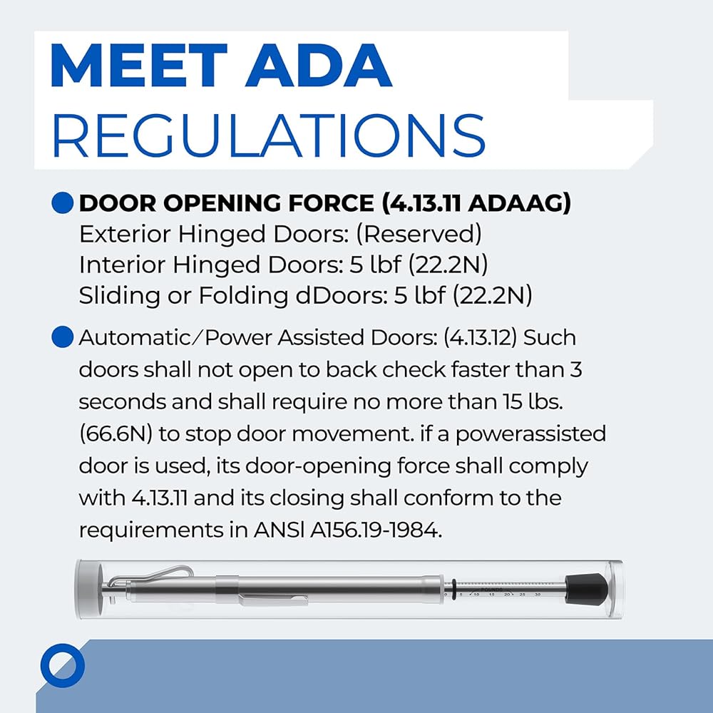 Meet for ADA Requirement: Engineered to comply for Americans with Disabilities Act standards, door pressure test tool ensures door opening force remains within the recommended exterior doors: reserved; interior doors: 5lbf (22.2N); sliding or folding doors: 5 lbf (22.2N). It helps building inspectors and contractors verify accessibility compliance, reduce liability risks, and maintain safe, inclusive environments for all users.
