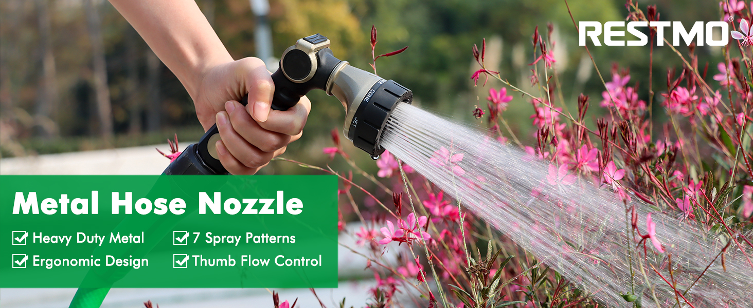 RESTMO Heavy Duty Hose Nozzle, Metal Garden Water Hose Sprayer with 7 Watering Patterns, Thumb Control, On Off Valve, High Pressure Nozzle Sprayer for Watering Plants, Car and Pet Washing, Bronze in Kuwait