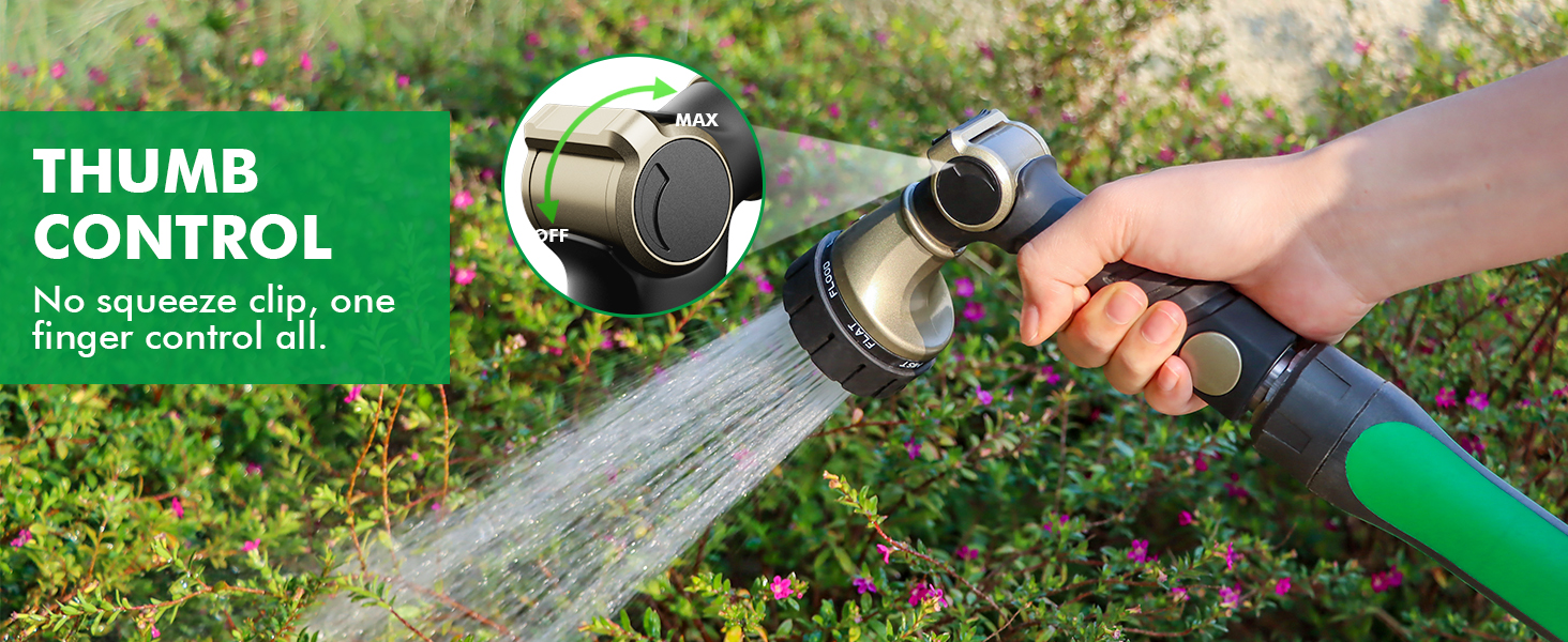• EASY TO USE THUMB CONTROLLER: Use this hose spray nozzle easily by pushing open the all-in-one thumb controller without efforts. No squeeze clip, One Finger Control All! Adds more convenience when you switch the watering between on & off, or high & low pressure.
