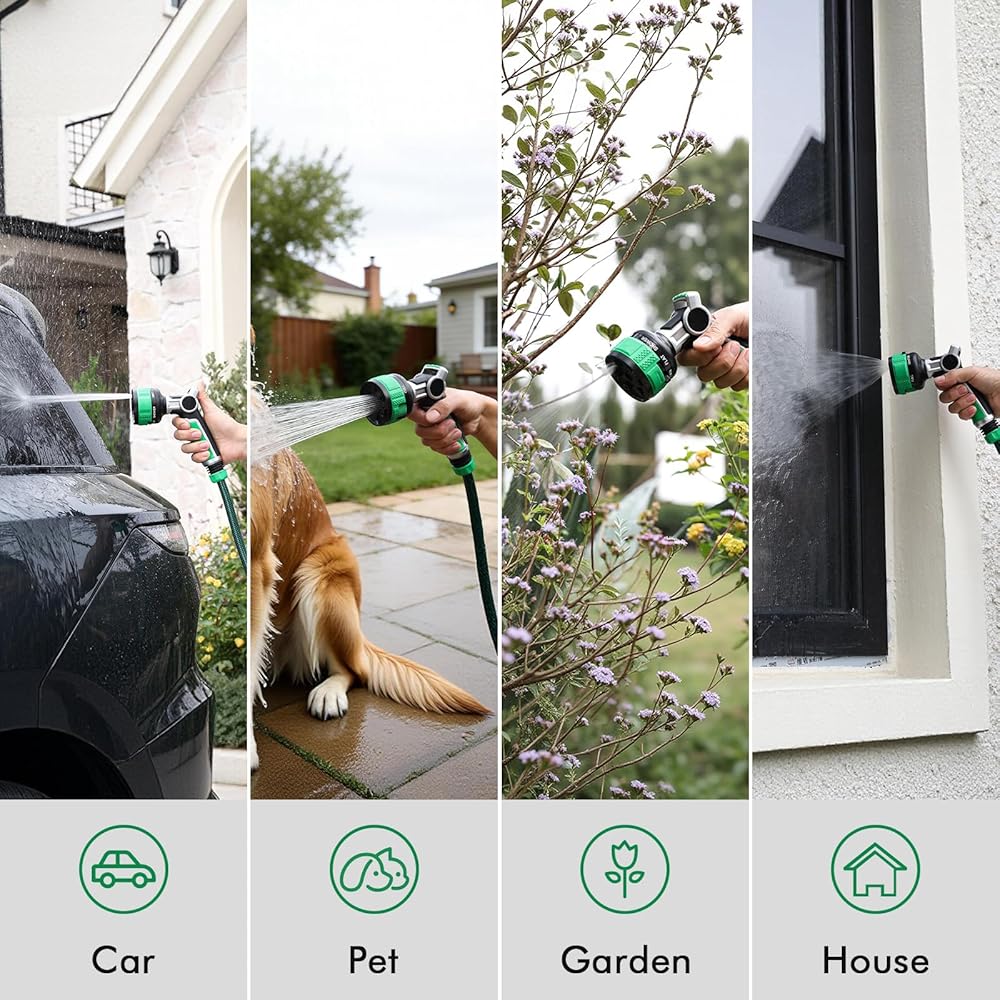 9 Adjustable Spray Patterns: From powerful cleaning to gentle watering, this nozzle does it all. Easily dial in the perfect pattern for any task: JET for tough stains, FAN for rinsing, RINSE for car washing, FLAT for sweeping patios, CONE for delicate plants, SHOWER for pets, FULL for filling buckets, MIST for cooling off, and CENTER for deep root watering.