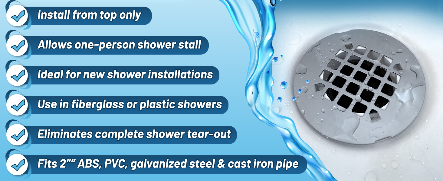 Use in Fiberglass or Plastic Showers: The shower drain replacement is designed to replace leaking drains in plastic and fiberglass shower stalls without the need to remove the shower or damage ceilings. It fits most fiberglass, plastic and acrylic(not suitable for tile showers) shower stalls and pans built in the last 25 years with standard 3.25" openings and can be installed over standard 2" ABS, PVC, galvanized steel, and cast iron drain pipes. NOTE: Your old drain flange diameter must measure between 4" and 4 1/2". The PVC body complies with most zoning codes.