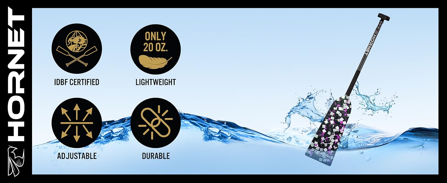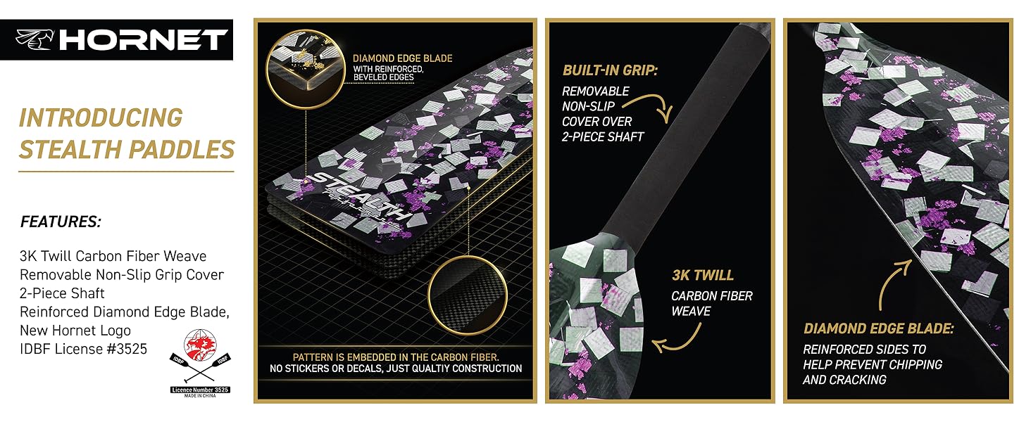 We're excited to introduce the STEALTH Performance Series, our latest evolution in dragon boat paddle design. The STEALTH series features a distinctive marbleized carbon appearance, delivering a raw, modern look that stands apart from traditional woven carbon designs. Built for competition, each STEALTH paddle is IDBF approved and engineered for high-level racing. The construction delivers excellent stiffness, responsiveness, and durability for powerful, efficient strokes. Like our Sting+ lineup, STEALTH paddles feature a PMI foam core, our proprietary reinforced Diamond Edge to help prevent chips and cracks, and a durable matte finish designed for long-term performance. Available in multiple bold accent colors, the STEALTH Performance Series combines elite performance with a striking, modern carbon aesthetic — no two paddles look exactly alike.