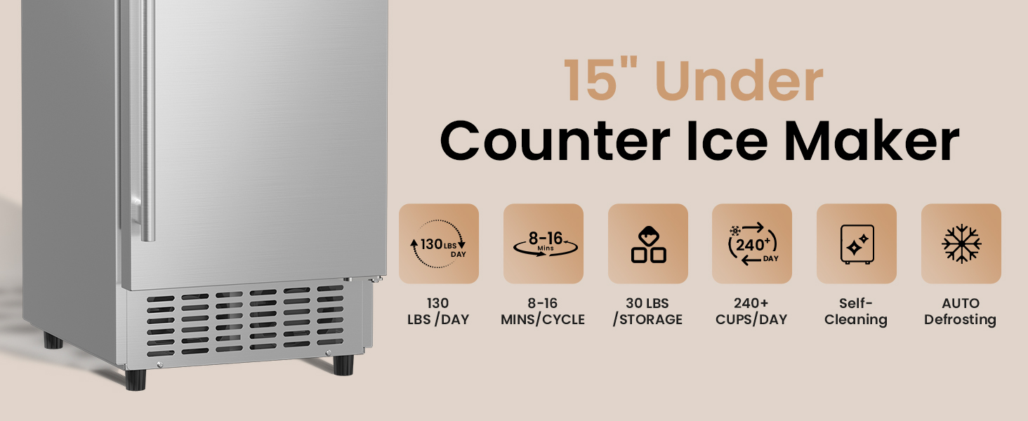 Under Counter Design and Outdoor Use: The compact ice machine has a space-saving built-in style, with dimensions of 15×20.7×33 inches and a standard 15” W that fits most kitchen or bar cabinetry. It's also engineered for reliable open-air use, ideal for home patios, outdoor bars or backyard kitchens. This dual-scene design allows flexible installation, indoors under counters or outside.