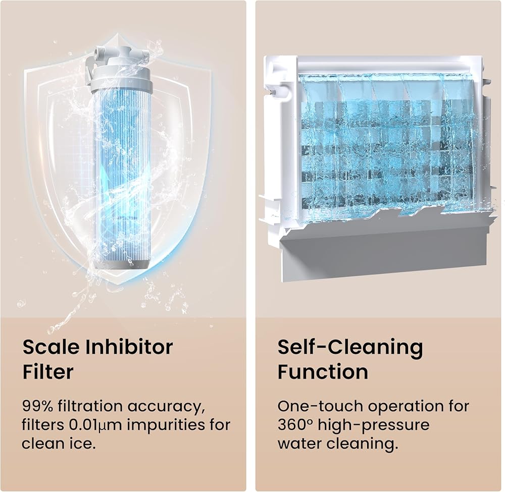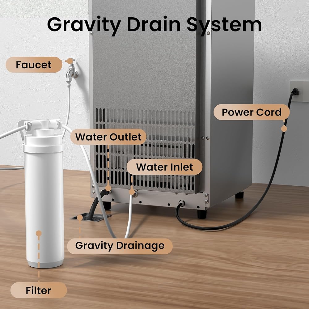 Gravity Drain System: The ice maker under counter features a gravity drain system that simplifies installation. Just position it correctly, and the system works smoothly without leaks. This design eliminates complex setup steps, no extra tools or professional help needed. It also maintains steady drainage over time, keeping your space dry and avoiding water buildup issues.